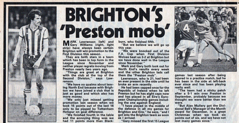 The Preston holy trinity was complete when Williams and Lawrenson were eventually joined at the Albion in the summer of 1980 by Robinson who arrived at the Goldstone via an unhappy spell at Manchester City.
