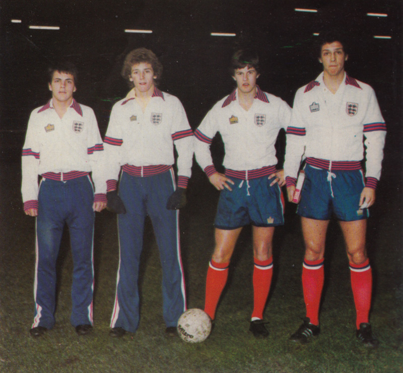 Looking for all the world like he’s dressed in a set of pyjamas, here’s a rather startled-looking Perry Digweed, second from left, showing off his Admiral England clobber along with fellow Fulham lads Mark Lovell, Tony Maloney and Tony Gale. While Brighton striker Peter Ward was banging in a famous hat-trick for England Under-21s against their Norwegian counterparts at the Goldstone around this time in late 1977, Digweed had played in the FA Youth team against Norway at Craven Cottage. The young keeper ended up joining the Albion three seasons later in a £150,000 deal, an incredible fee for a teenage reserve goalie. Nevertheless, he repaid the faith, serving twelve years with the club.