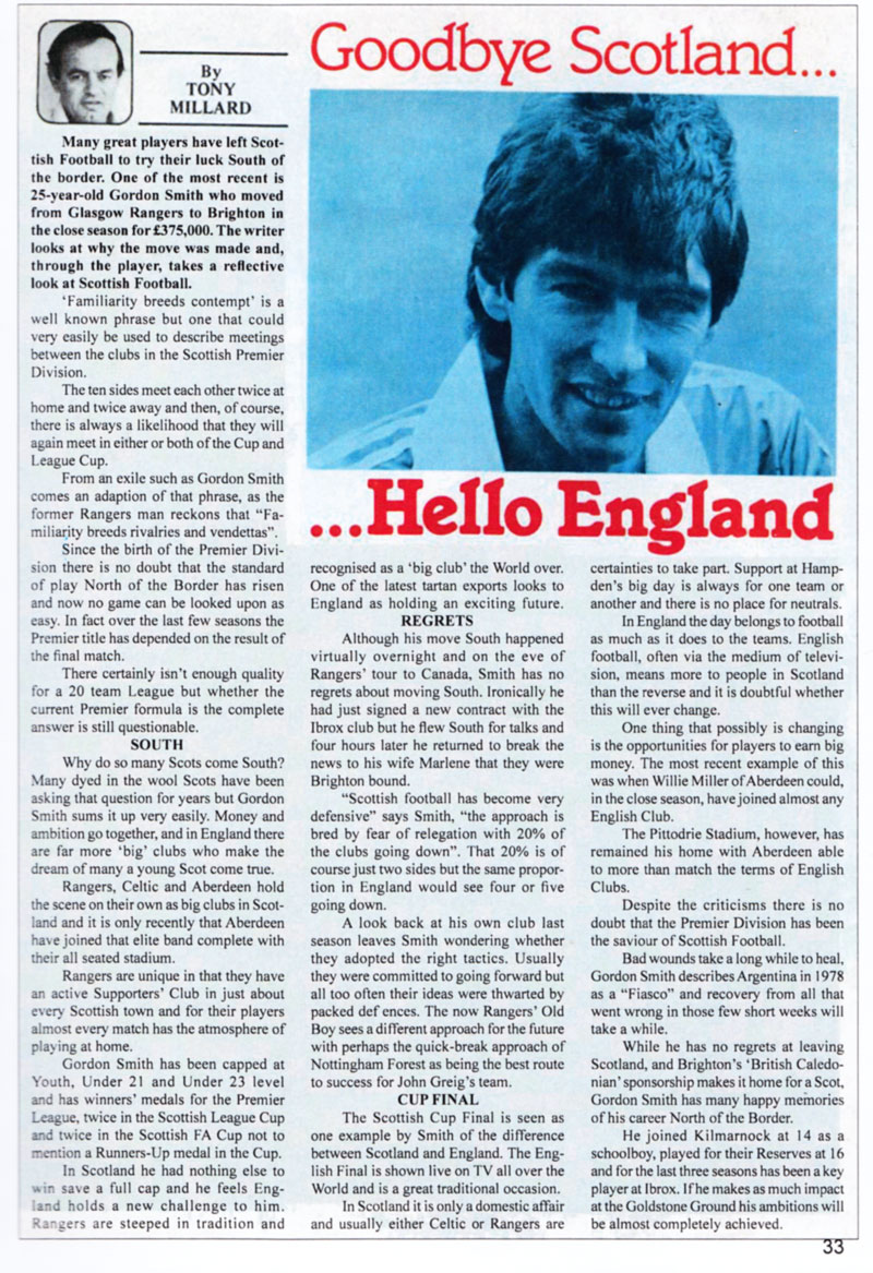 From Programme Plus, a piece by Tony Millard, covering the recent move of Gordon Smith from Rangers to Brighton, and the state of the game north of the border: