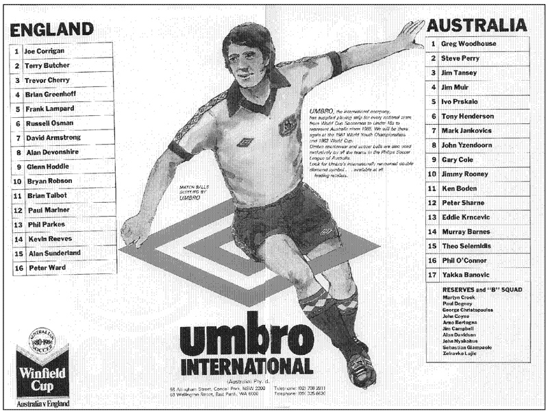 Here’s the centre pages of the Australia v England programme on Sydney Cricket Ground on 31st May 1980. Although a friendly in all but name, at the time the match formed a fixture in the Winfield Cup, a competition to celebrate the centenary of soccer in Australia: