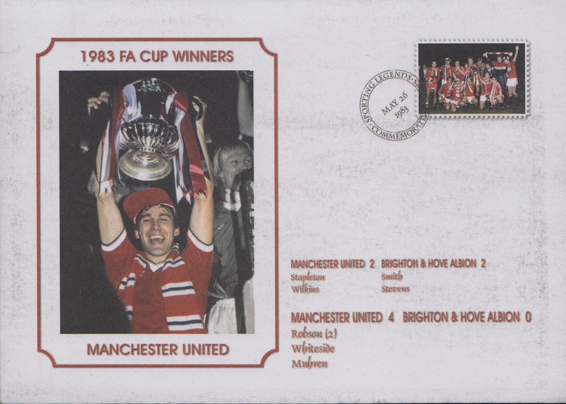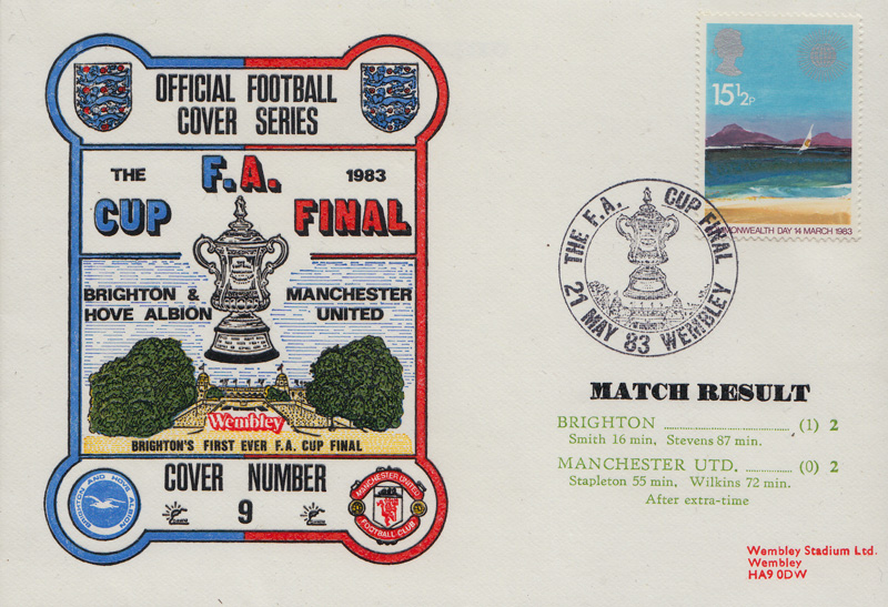 Stylistically, though, with its hand-drawn players, it wasn’t far removed from the Peterborough first day cover. By May 1983, however, the curtain had come down on Brighton’s spell as a top flight club. Even so, the club garnered enormous exposure through its appearance at the season’s FA Cup Final, and this included three (count ’em!) first day covers issued.