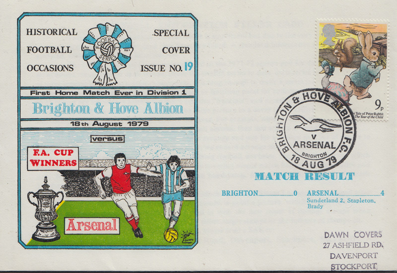 The Goldstone Wrap has previously featured a first day cover commemorating Brighton’s debut in the First Division in 1979 against Arsenal.