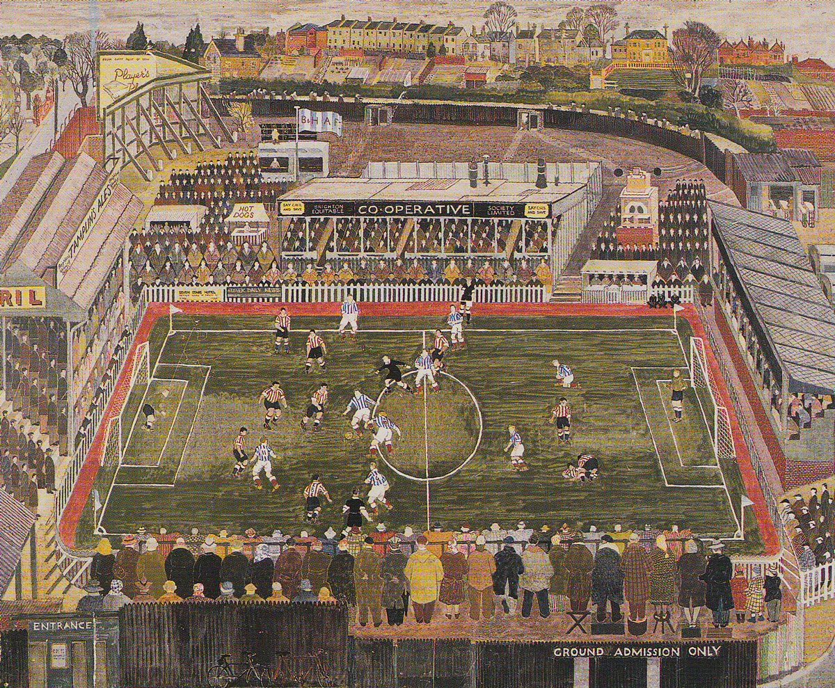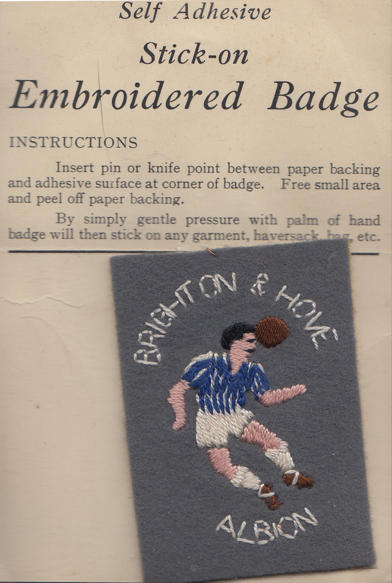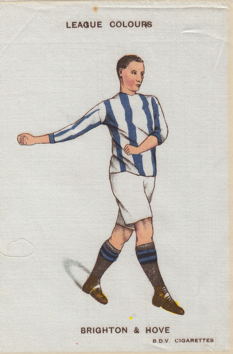 Once, sew on football-themed patches must have been all the rage, judging from these striking designs lent to me by Nick from Fishersgate. We kick off with this printed cloth by B.D.V Cigarettes, featuring an Albion player sporting broad white stripes: