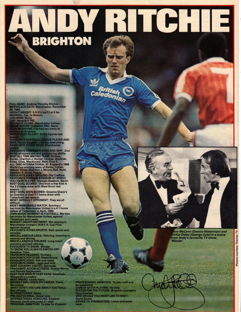 When Andy Ritchie moved from Manchester United to Brighton in 1980, it broke the the Seagulls’ record transfer fee. Undoubtedly, the Sussex club got the best deal in a bizarre triangular deal that saw Peter Ward move from Brighton to Nottingham Forest and Garry Birtles from Forest to Manchester United. Mike Anderson reports on Ritchie’s prospects: