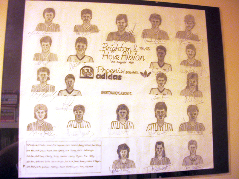 This is my rather unique collection of Albion autographs from 1984/85. I drew the squad, rolled it up, shoved it in a tube and sent it to the Goldstone. Back it came, as requested, fully autographed and given the official club stamp.