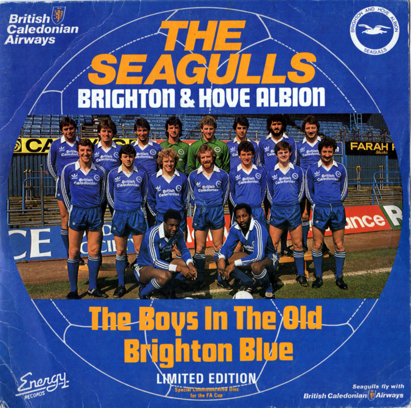 Here are the the 12″ and 7″ versions of Brighton’s 1983 FA Cup Final song, with ‘The Goldstone Rap’ as the B-Side, released on Energy Records: