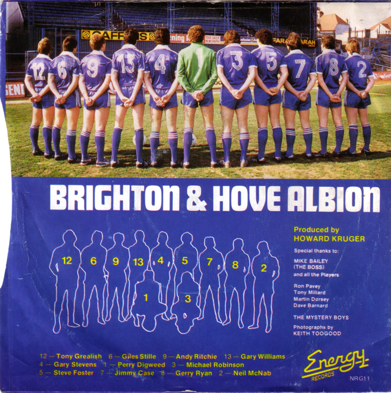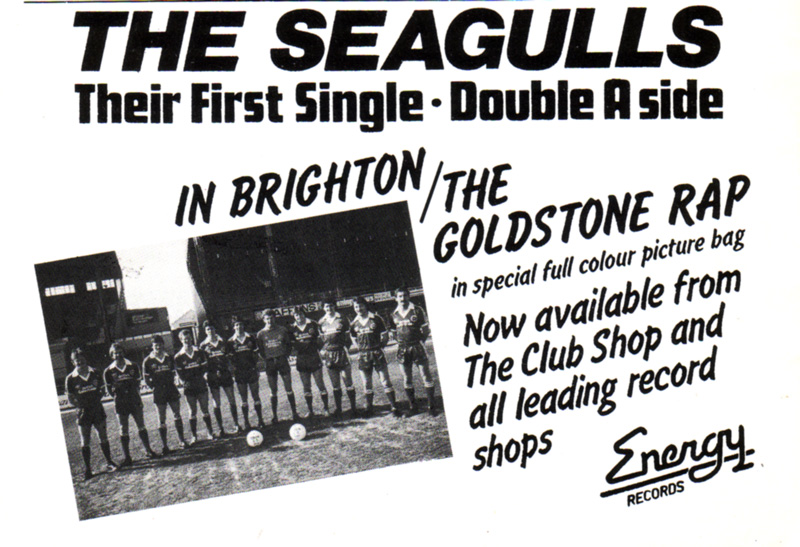 Here are the the 12″ and 7″ versions of Brighton’s 1983 FA Cup Final song, with ‘The Goldstone Rap’ as the B-Side, released on Energy Records: