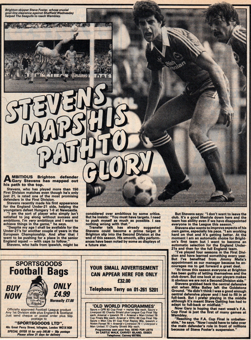 Stevens grabbed back the central defensive slot when Mike Bailey left the Goldstone Ground. “He didn’t think I was a good enough central defensive player and I had to fill in at full-back. But I prefer playing in the middle although it’s meant Steve Gatting has had to adapt to full-back or midfield.”