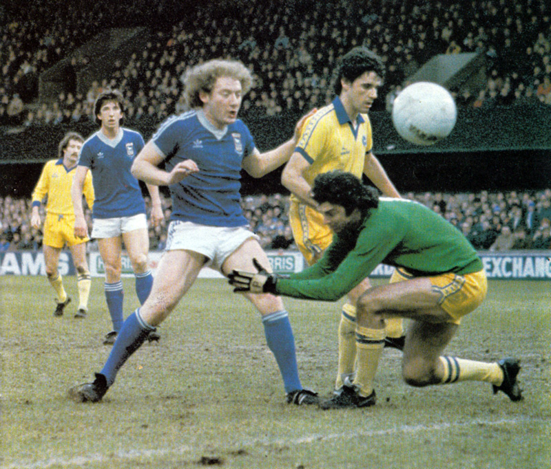 Peter Ward, a constant danger with his sharp running and turning, was brought down just outside the Ipswich area. Horton and O’Sullivan combined to find a promising gap for Williams to aim at but as the Brighton man was about to shoot he found the referee blocking his way.