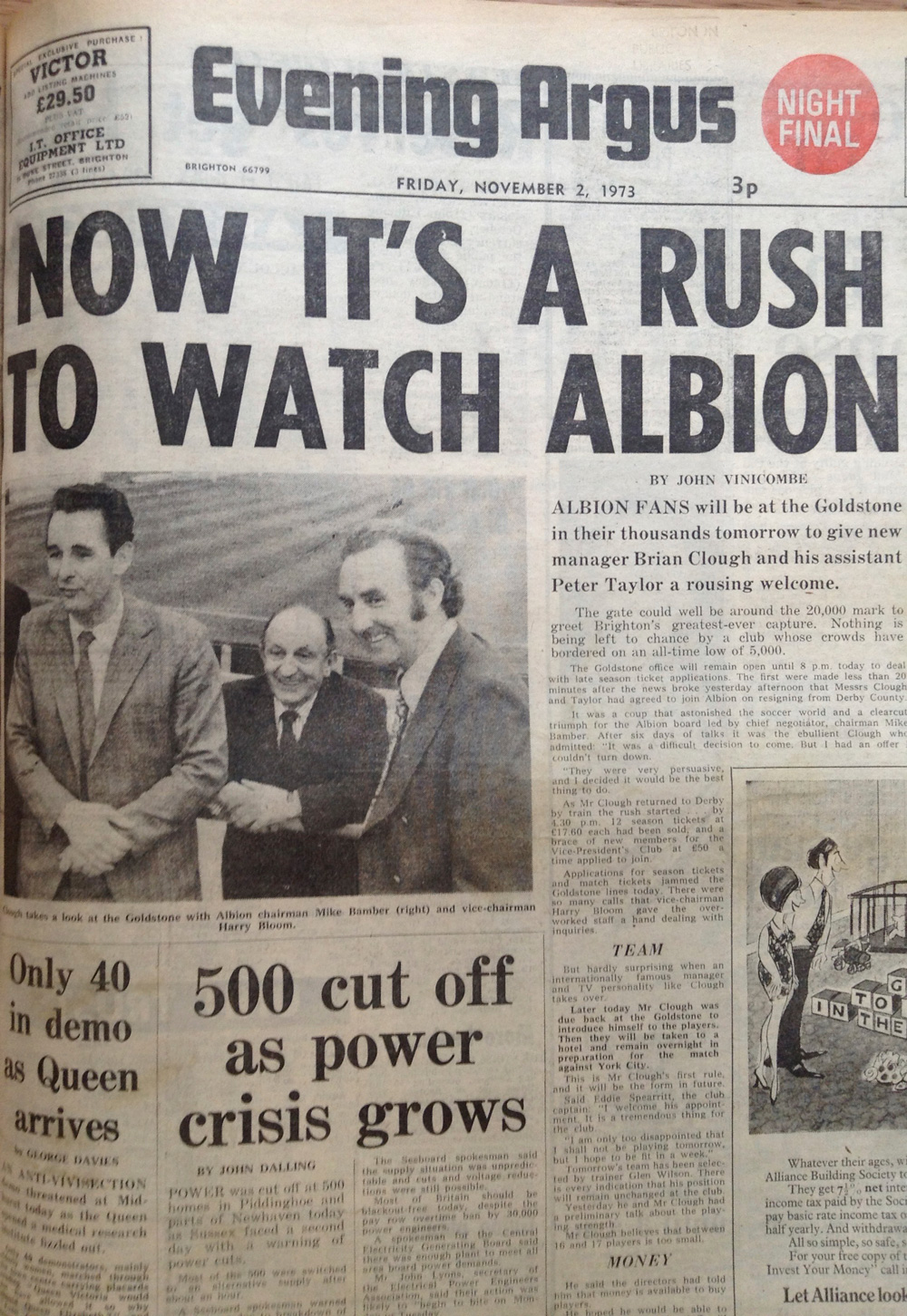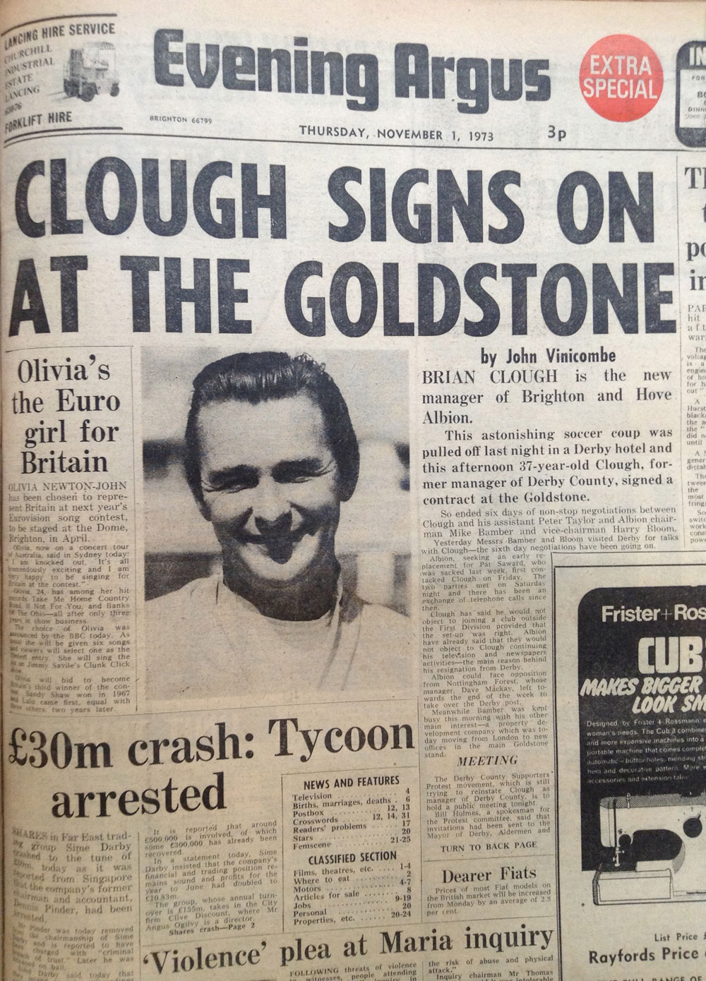 Unsurprisingly, there was a massive media whirlwind around the sensational news that Brian Clough had taken over as the manager of Third Division Brighton. As a result, the story dominated the front page as well as the back page of the Evening Argus over the next few days. From Friday 2nd November 1973: