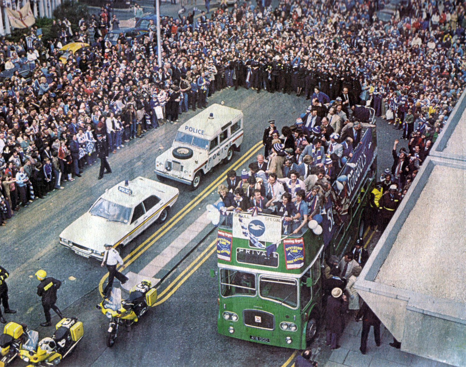 Above is the picture that sums up the players’ triumph – an open-topped bus journey through the streets of Brighton and Hove on Sunday morning. More than 100,000 delighted fans packed the roadside to cheer their heroes.