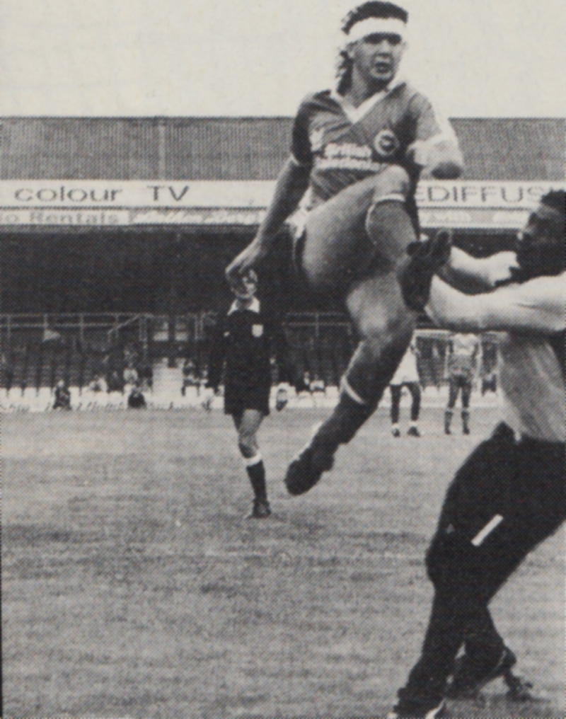 Here’s Steve Foster’s high challenge that created the opening for Tony Grealish to get Albion’s first goal. So high, the cameraman almost missed it.