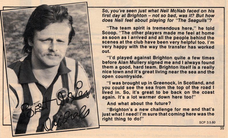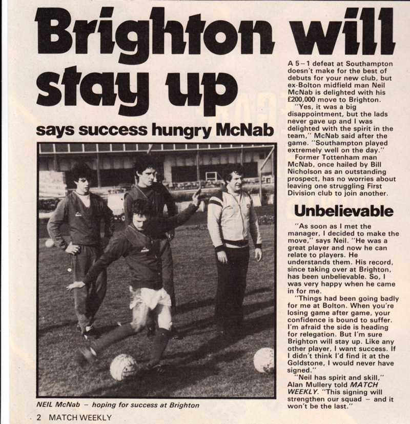 “To me it’s always a strange feeling playing against old friends, which is probably another reason for my disappointing performances, but I’ll be treating it as another game and will be going flat out to help Brighton win.” McNab is only too aware of how vital it is for Brighton to take both points on Saturday in their struggle to avoid relegation to the Second Division.