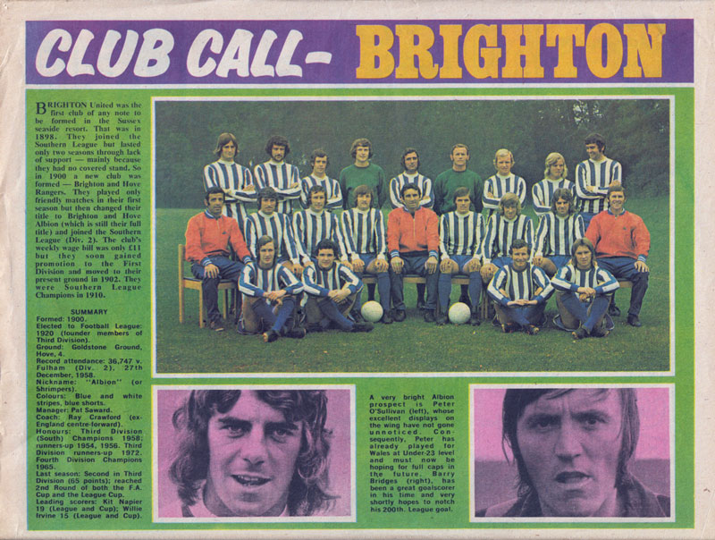 The cry Dolphins never roll easily off the frenzied lips of even the most ardent fan – even when your team was getting the better of Crystal Palace. The Albion have always tried to develop the seaside theme and in pre-war days were known as Shrimps. Many would suggest the nickname was rather appropriate: they were rather small fry and inclined to be gobbled up by the Football League’s big fish. Added to that, Gillingham were also known as the Shrimps, which complicated things. The re-named Dolphins was intended to develop the local link as the Brighton town crest has them, but it never had popular appeal.
