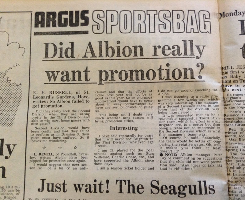 “Albion have been pipped for promotion once again. I would suggest that next season will be a bit of an anti-climax and that the efforts at home will not be as good as this year. So an enormous improvement would have to come about in away performances to have any sort of chance of going up. This being so, I doubt very much whether next season will bring promotion either. I have said repeatedly for years that I will never see Brighton in the First Division whatever age I reach.”