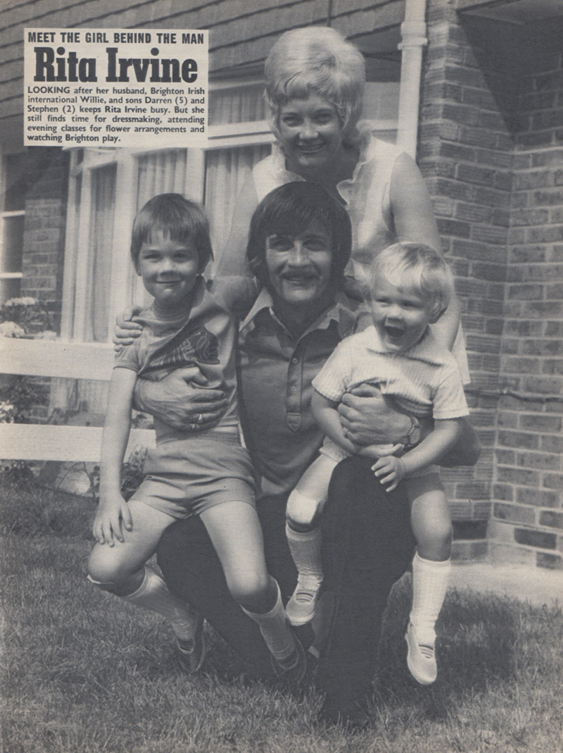 Such was Willie Irvine’s tremendous form in 1971/72 for the Albion that he fought his way back into the Northern Ireland team in the summer of 1972. Here, he gets an assist for Terry Neill’s winner against England at Wembley in the Home Internationals: