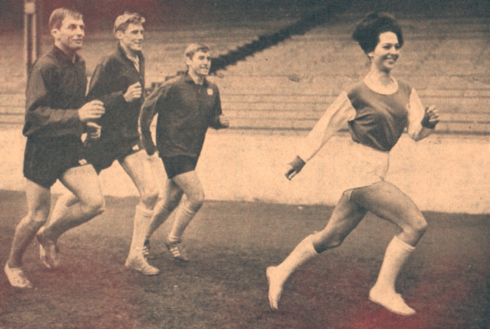 Wearing the colours of her home town soccer club, Brighton and Hove Albion, Nicky Bradley, 20-year-old Miss Brighton, sets the pace for Manchester City players Alan Oakes, Cliff Sear and Dave Connor as she trains with the City team at their Maine Road ground.
